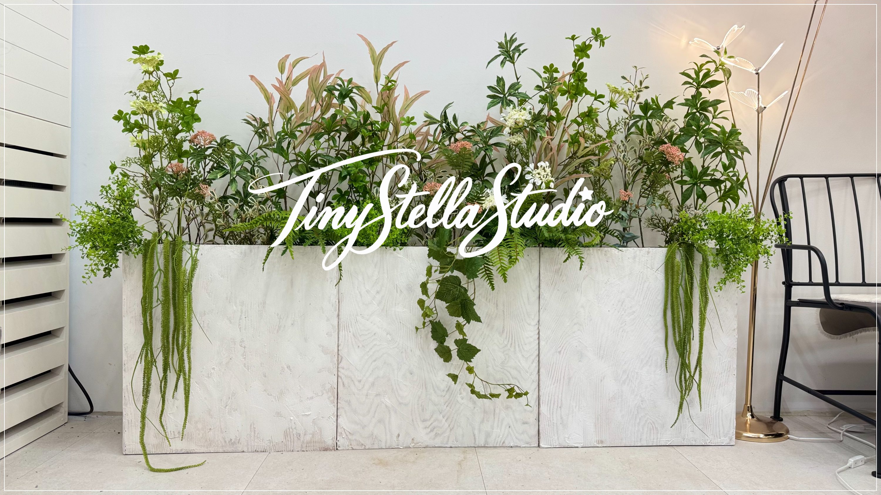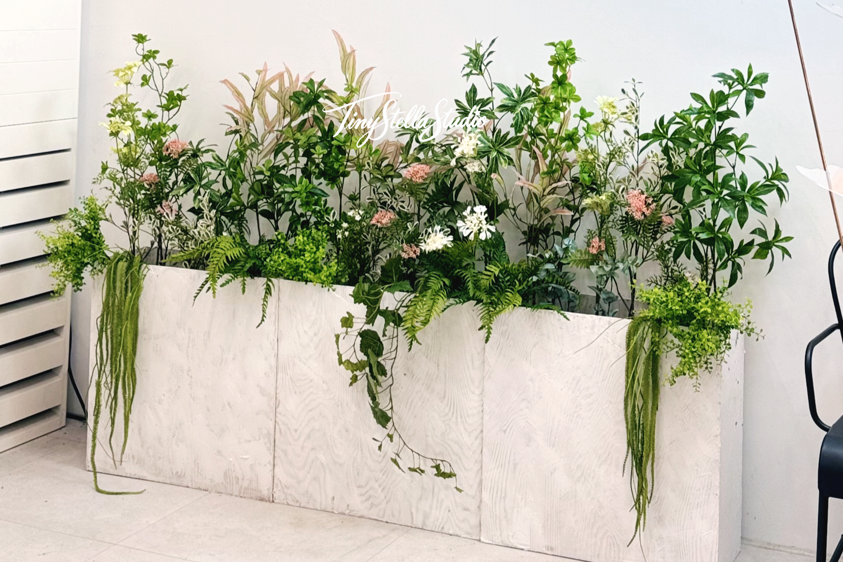 드디어 완성된 모습입니다! 3개의 박스를 나란히 배치하니 근사한 파티션이 되었죠? 밋밋했던 공간이 금세 화사한 봄 정원으로 변신했습니다. 조명까지 더해지면 밤에는 더욱 은은하고 고급스러운 분위기를 연출할 수 있습니다.